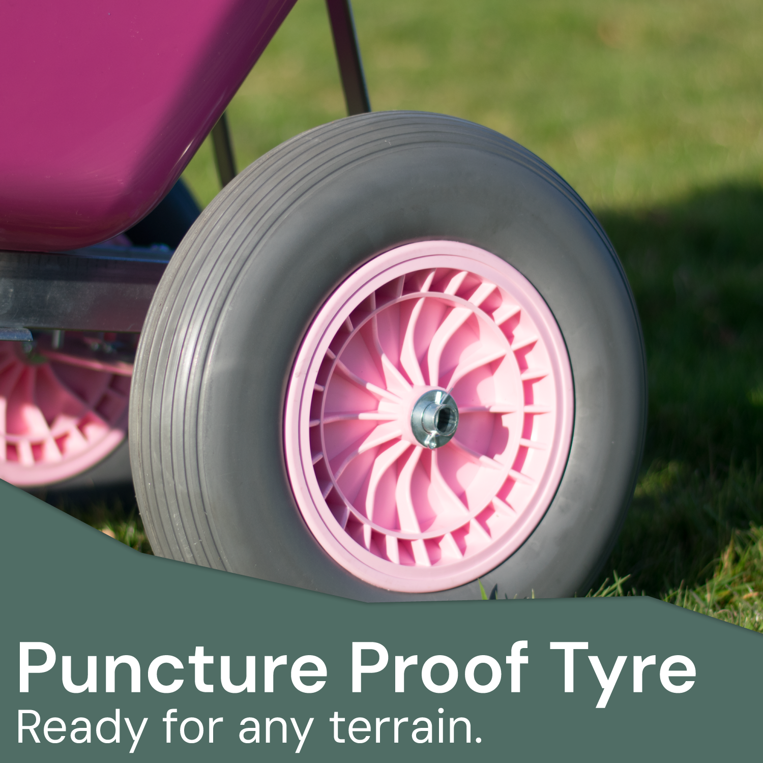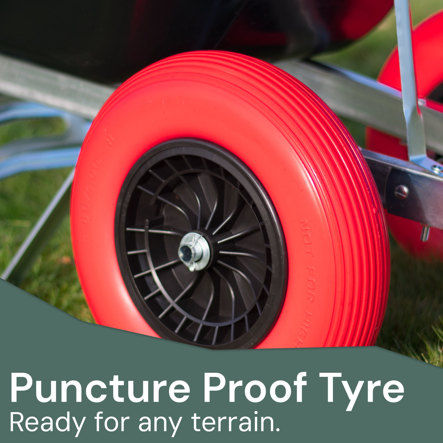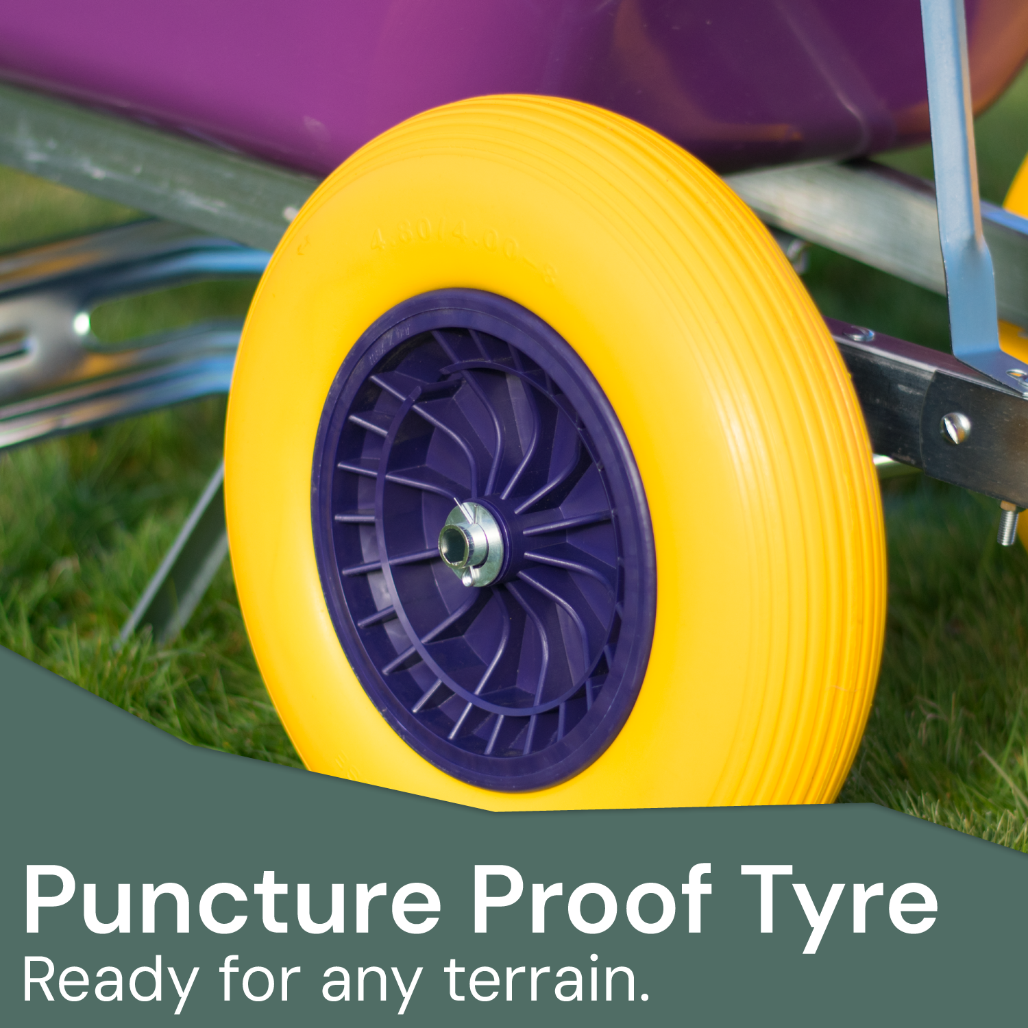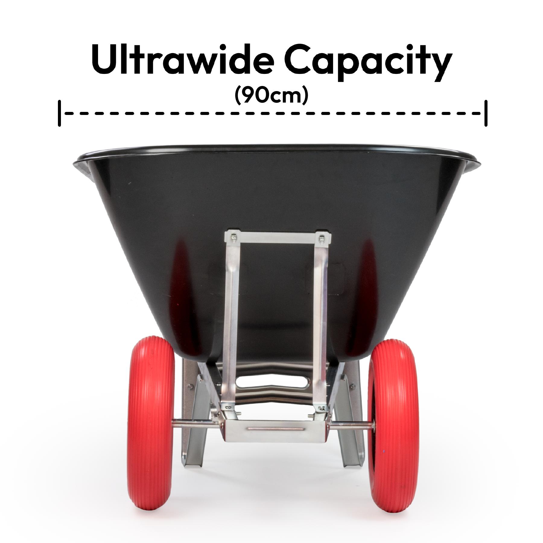 Each Wheelbarrow has 2 puncture proof durable tyres that, unlike single wheel designs, creates greater stability when in use. The front end has the security of 2 solid puncture proof wheels underneath and will ensure even heavy loads can be transported safely without becoming unbalanced or tipping over.